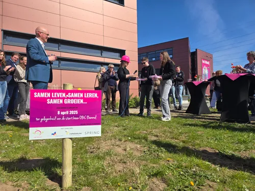 De bijeenkomst vond plaats vlak naast het bouwterrein waar het nieuwe schoolgebouw de komende maanden verrijst. Met roze bouwhelmen, scheppen in de grond en de bouwplaats op de achtergrond gingen de betrokkenen aan de slag.