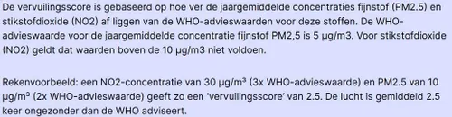 Beter kijken hoe jouw wijk ervoor staat? Kijk hier ga naar de kaart, zoek de gemeente op en klik erop. De gemeente komt groter in beeld en je kunt dan met je cursor kijken hoe het per wijk is, boven de kaart kun je kiezen uit vervuilingsscore (standaard in beeld) Stikstofconcentratie en fijnstofconcentratie