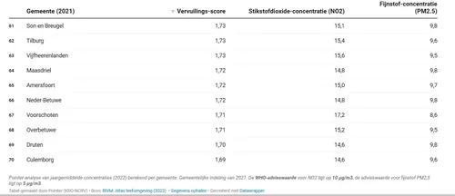 Pointer maakte een digitale kaart waarop niet alleen te zien is hoe gemeenten scoren, maar zelfs op wijkniveau te zien is hoe het met de lucht gesteld is en hoe ver de jaargemiddelde concentraties fijnstof (PM2.5) en stikstofdioxide (NO2) af liggen van de WHO-advieswaarden. Deze zijn gecombineerd in een vervuilingsscore: de gemiddelde overschrijding van de advieswaarden van de WHO voor stikstofdioxide en fijnstof.