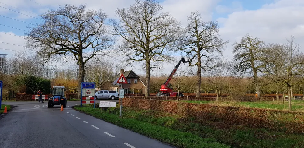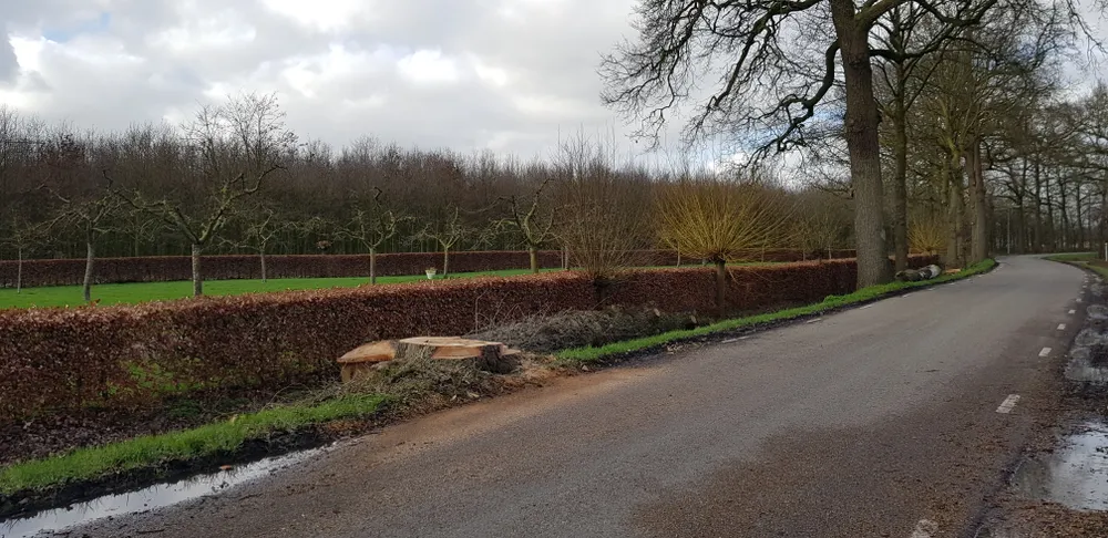 Woensdag was het zover; de weg werd voor een gedeelte afgezet. De dode boom werd omgezaagd. Niet alleen deze boom, maar verderop werd nog een eik geveld. Er rest alleen nog paar stronken, een flinke takkenbos en de dikke stammen in de berm. De gevelde eiken hadden een behoorlijke omvang, dus die stonden er al een aantal jaren.