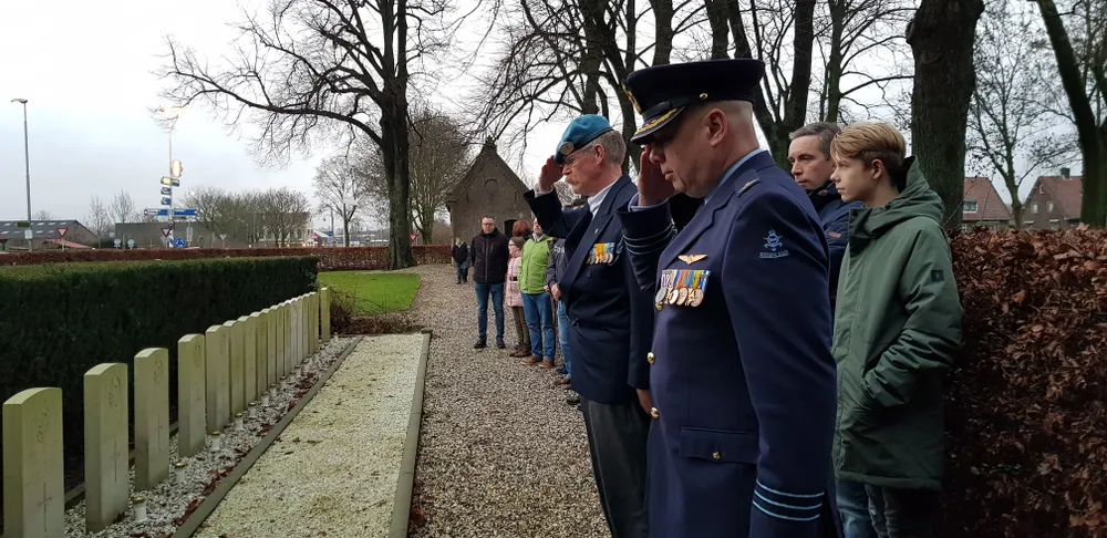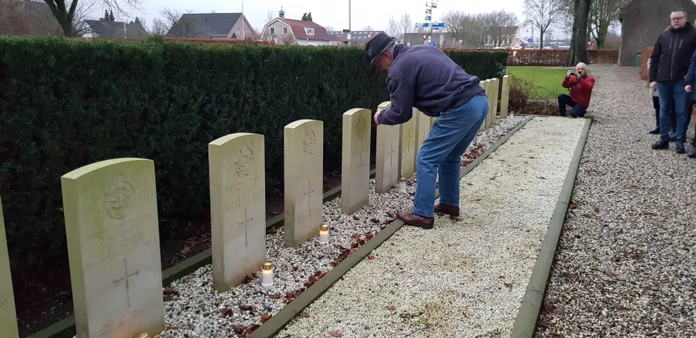 Rob van Leeuwen en Roel van Essen hadden de ceremonie georganiseerd. In vol ornaat stonden Rob van Leeuwen en Roel van Essen bij de twintig grafstenen waaronder 21 gevallen soldaten uit de tweede wereldoorlog liggen.