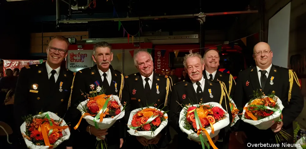 De zes leden van de vrijwillige brandweer kregen de Koninklijke Onderscheiding opgespeld vanwege hun langdurige verdiensten voor de brandweer in de gemeente Overbetuwe.