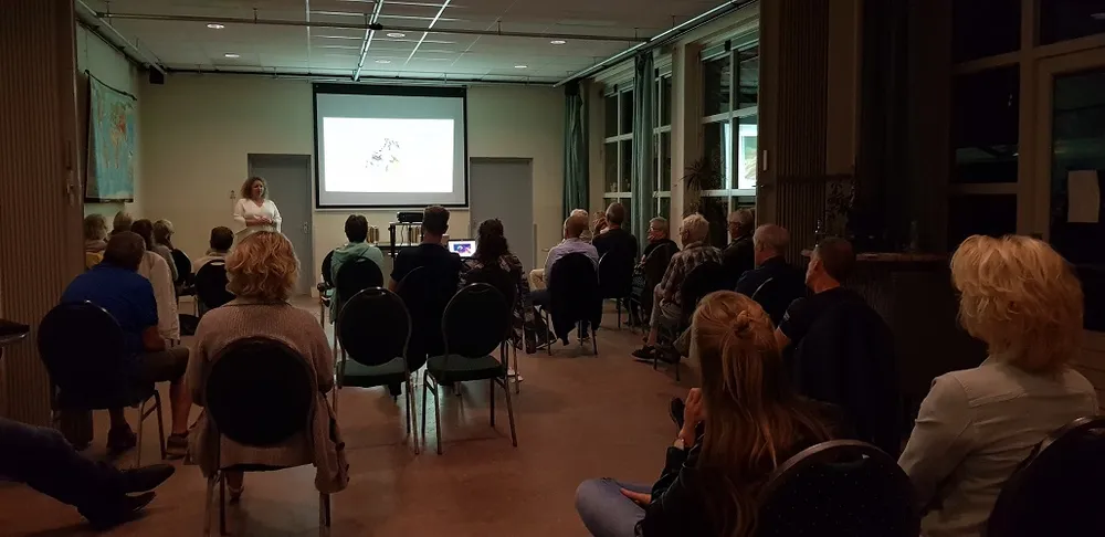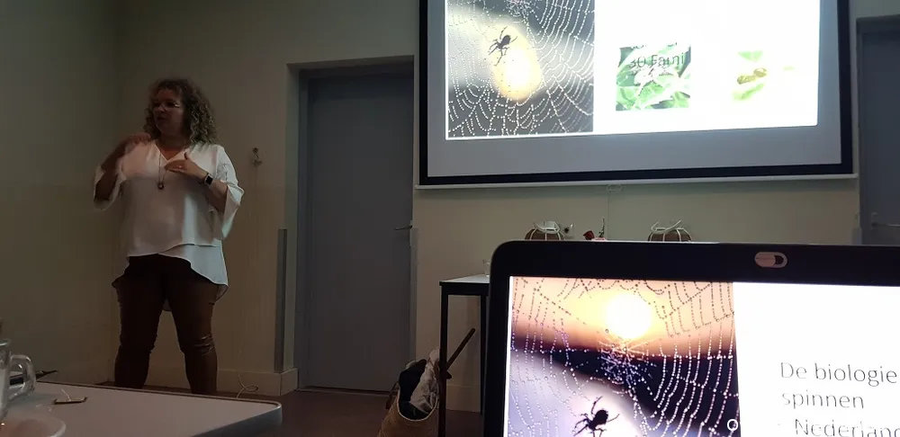 Spinnenexpert Andrea Dekkers vertelde over de fascinerende wereld van de spinnen. Tijdens de diapresentatie kwamen de aanwezigen te weten hoe verschillende de spinnen zijn. Spinnen leven niet lang, hooguit een of twee jaar. Ze houden de insectenpopulatie in toom en zijn zelf ook prooi voor andere dieren, zoals vogels, ook soms voor een eigen soortgenoot.