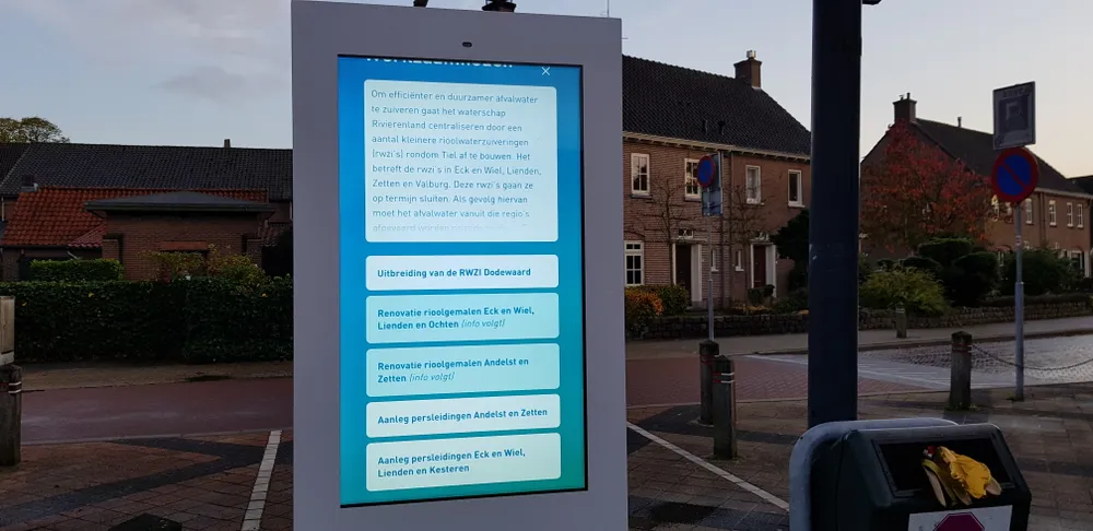 Zo is er op het bord te lezen dat er een renovatie gepland staat voor de rioolgemalen in Zetten en Andelst. Maar ook voor meerdere plaatsen in de Betuwe komt later meer op de zuil te staan. Waterschap Rivierenland bestrijkt een groot gebied. Vanaf het begin van de Beneden Merwede, de Lek, Waal en de Maas, bij Papendrecht, Alblasserdam en Sliedrecht tot aan Arnhem waarbinnen alle rivieren als Nederrijn en Linge vallen. Zij zorgen voor voldoende schoon oppervlaktewater en veilige dijken. Dat zijn de belangrijkste taken van Waterschap Rivierenland. Maar ook de riolering valt eronder.
