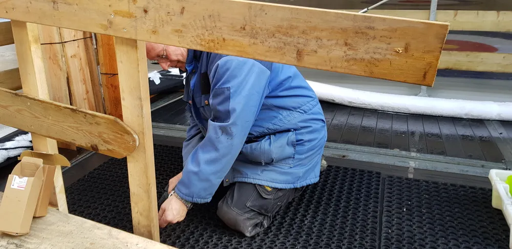 Rogier Brinken, Arno Vink en Hans Rutger van de technische dienst moeten ervoor zorgen, dat het Winterfestijn goed wordt opgebouwd. Het opstapje moeten veilig zijn, dus de leuning wordt extra gecontroleerd en nog met wat extra schroeven nog steviger vastgezet.