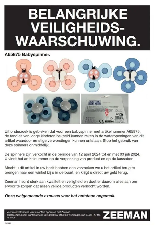 Gebruik deze babyspinners niet meer, maar breng ze terug naar een filiaal van Zeeman. Je krijgt het aankoopbedrag direct terug. Voor meer informatie kun je bellen naar 088 – 007 000 of een mail sturen naar