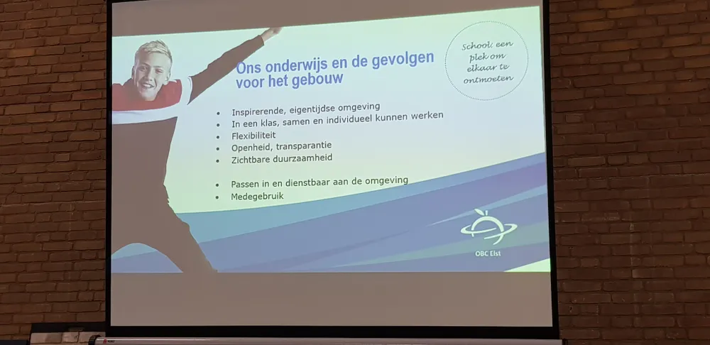 In de oude gymzaal werd een presentatie gegeven over het nieuwe OBC dat er gebouwd gaat worden. Charles Lohnstein, directeur, en Dick Kapteijn, hoofdconciërge, vertegenwoordigden het OBC. Jaap van Es, Van den Berg Architecten gaf uitleg over het gebouw. Carla van der Biezen, gemeente Overbetuwe, kon laten zien hoe de omgeving van de school eruit zal komen te zien.