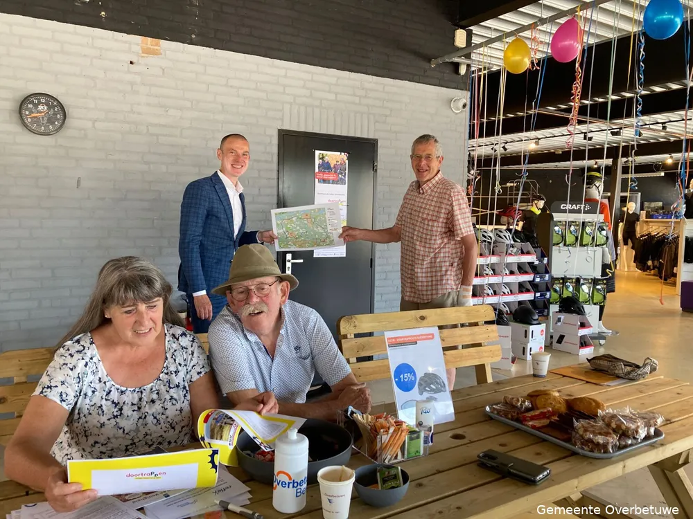 Heteren - De feestelijke lancering van de eerste Doortraproute van Overbetuwe is donderdag 30 juni gehouden. Willem van Middendorp, voorzitter van de Fietsersbond, overhandigde de doortraproute Zetten/Overbetuwe aan wethouder Wijnte Hol.